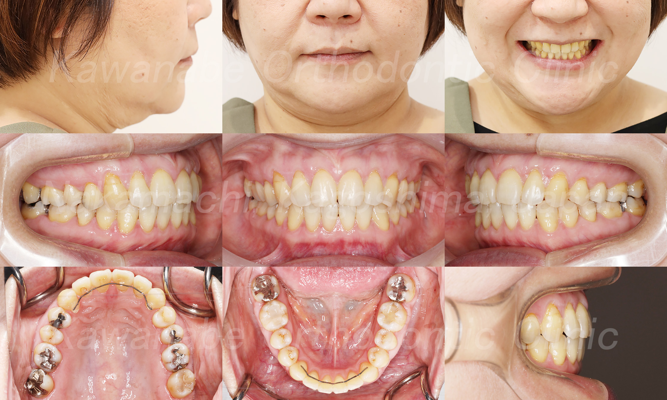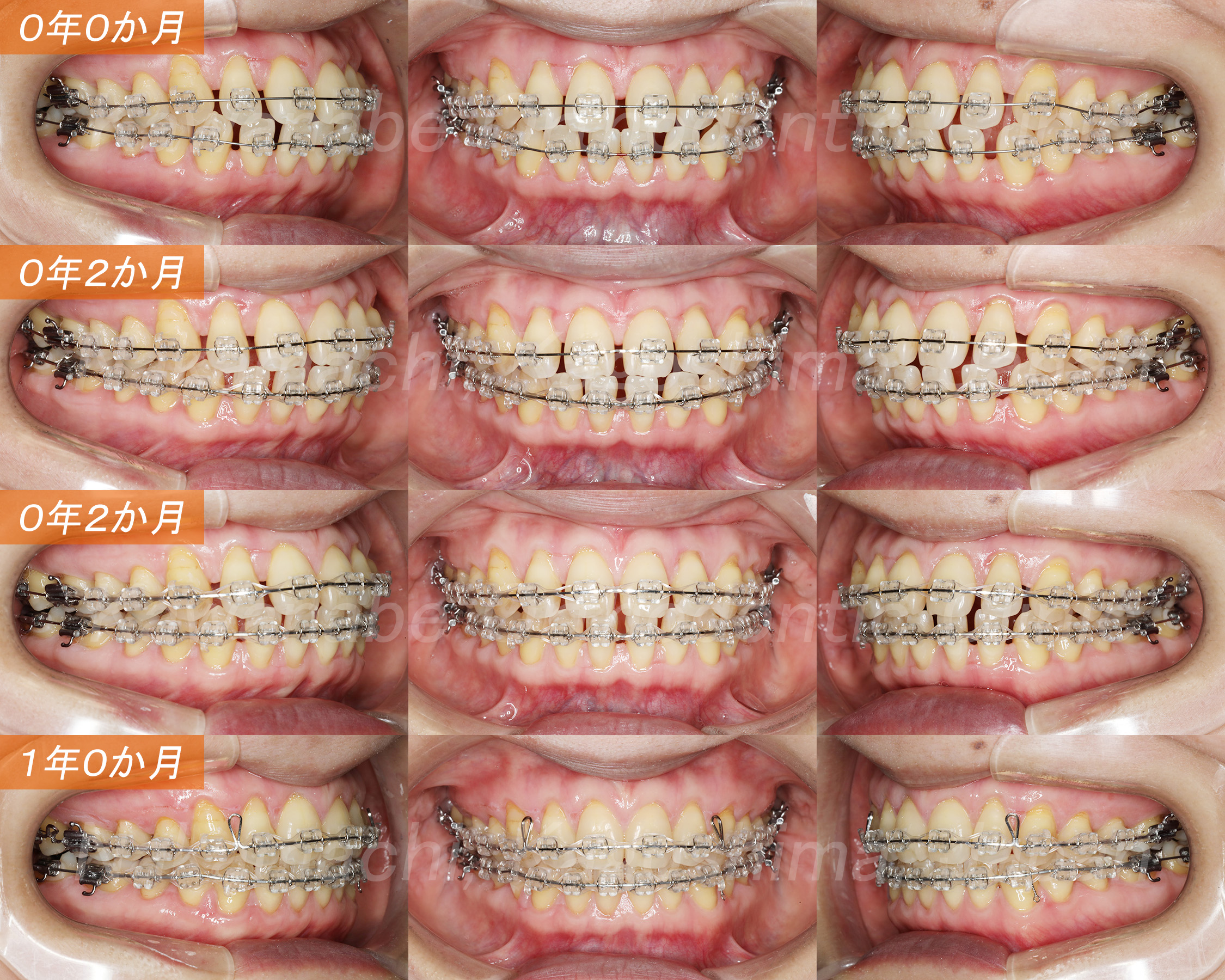 事例 17 すきっ歯(47歳 女性) 術前又は術後の写真に通常必要とされる治療内容 主訴 すきっ歯 診断名あるいは主な症状 空隙歯列弓 年齢・性別 47歳6か月 女性 治療に用いた主な装置 マルチブラケット装置 抜歯部位 なし 治療期間 1年3か月 治療方針 マルチブラケット装置を用いて、上下顎歯列の空隙閉鎖と歯の排列を行うことにしました。 費用等に関する事項 治療費 752,620円(税込) 治療等の主なリスク、副作用等に関する事項等 リスク・副作用 歯:齲蝕(むし歯)、歯質の欠損、歯根吸収、骨癒着、歯髄炎、歯髄壊死 歯周組織:歯肉炎、歯周炎、歯槽骨骨吸収、フェネストレーション、歯肉退縮、知覚過敏 軟組織:外傷、やけど(化学的・機械的)、アレルギー(特にニッケルとラテックス) 歯科矯正用アンカースクリュー:破損、脱離、誤飲、歯根損傷 その他:(歯などの)痛み、装置の破損・脱離・誤飲、顎関節症、細胞毒性、感染、放射線被曝、治療期間の長期化、治療目標が完全に達成できない、後戻り、非症候群性原発性萌出不全(Primary Failure of Eruption) 治療前 治療中 0年0か月:レベリング 0年8か月:下顎歯列空隙閉鎖 0年9か月:上顎歯列空隙閉鎖 1年6か月:ディテイリング 治療後 1年3か月 マルチブラケット装置を用いた空隙歯列弓の治療です。治療後は上下顎歯列の空隙が閉鎖されて笑顔がとても素敵になり、大変喜んでいただきました。 上の前歯がねじれている、右下の歯を揃えたい(18歳 女性)