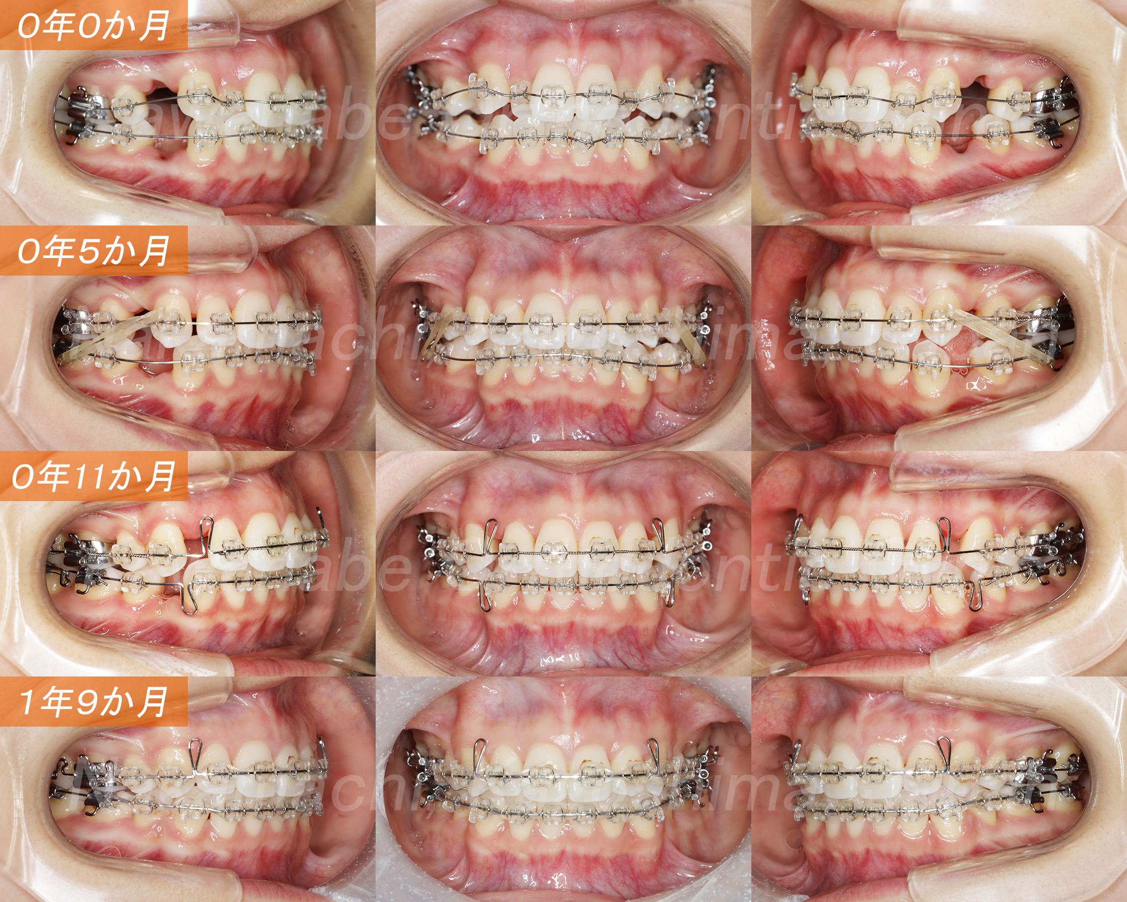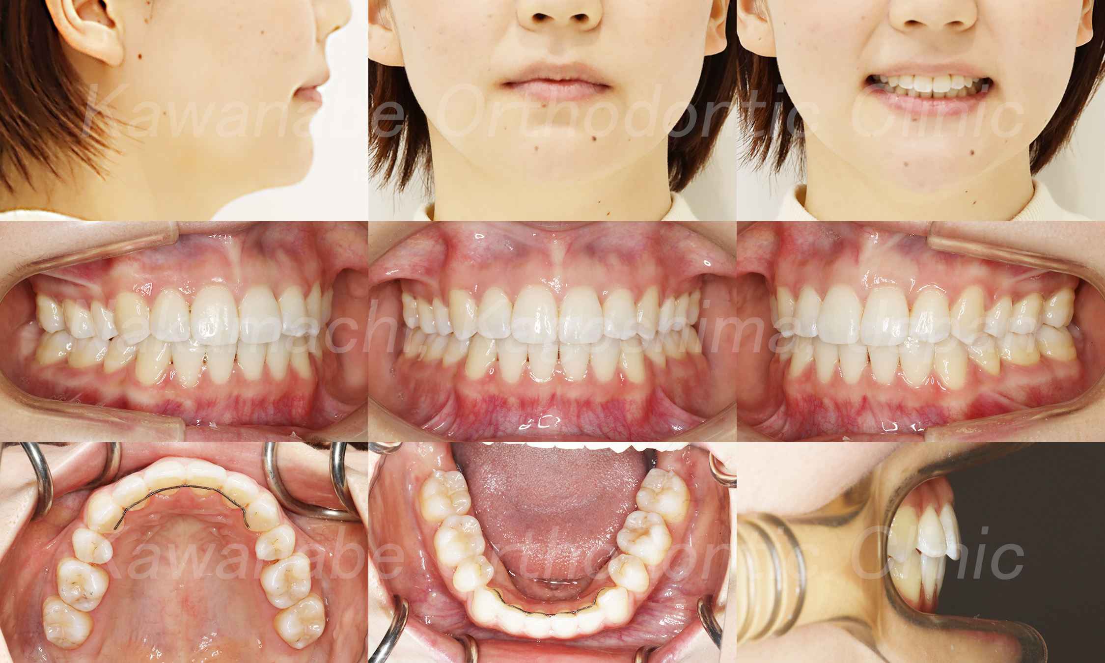 マルチブラケット装置を用いた叢生の治療です。歯科矯正用アンカースクリューは使用せず、代わりにヘッドギアとII級ゴムを用いて治療を行いました。治療後は叢生だけでなく口唇突出も改善されて、とても素敵な笑顔になりました。